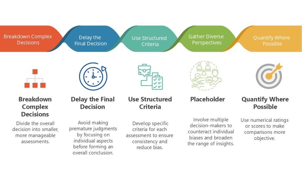- Delay the final decision: Avoid making premature judgments by focusing on individual aspects before forming an overall conclusion.