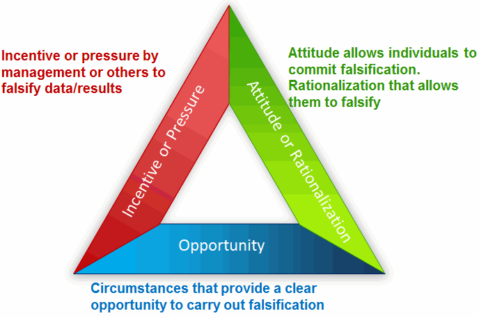 | Opportunity | The opportunity to falsify data can be due to encouragement by management as a means of keeping cost down or a combination of lax controls or poor oversight of activities that contribute to staff being able to commit fraud. | Implement a process that is technically controlled so there is little, if any, opportunity to commit falsification of data. |