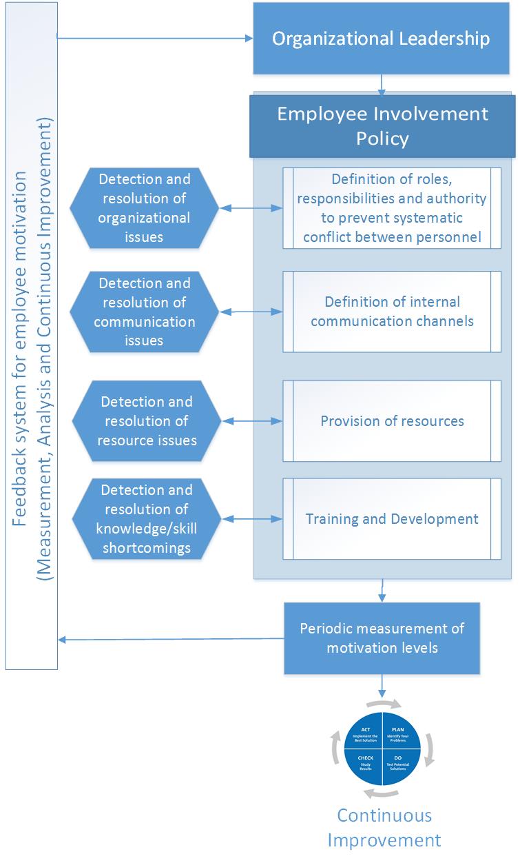 Five mechanisms can be leveraged to improve organizational system design: 1) Eliminate organizational issues related to roles, responsibilities and authorities of employees, 2) establish a policy of transparency and effective “bottom-up” internal communication channel to permit employee contribution and recognition, 3) establish criteria for resource distribution, 4) establish a commitment to identify needed training and provide resources for the purpose and 5) establish a systemic feedback loop for analysis and improvement of employee motivation based on periodic measurement of employee motivational levels.