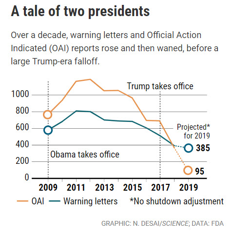 Investigative report on FDA enforcement under Trump from Science’s news department shows a steep decline in enforcement actions.