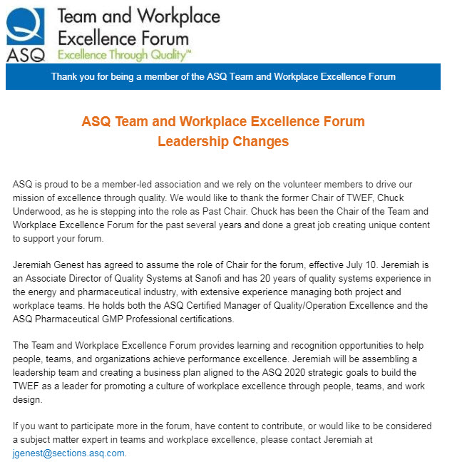 It is now officially announced. I have volunteered to be the chair of the Team and Excellence Forum for the ASQ.