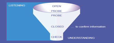 At the mouth of the funnel we begin with an ‘open’ question. This question is intended to give the interviewee the widest possible scope for responding. Sometimes it may be necessary to repeat or rephrase this question to give the interviewee more thinking time and further opportunities to raise information. Working down the narrowing body of the funnel we use a series of probing questions to draw out further specific information and help complete the picture. Closed questions then have their place to draw out, check or confirm specific pieces of information, or to get the interviewee to commit on a point more precisely. This then brings us to the bottom of the funnel where we clarify, using a short summary, what we have got out of the discussion, aiming to check our understanding of the main points. The question sequence might go something like this:
