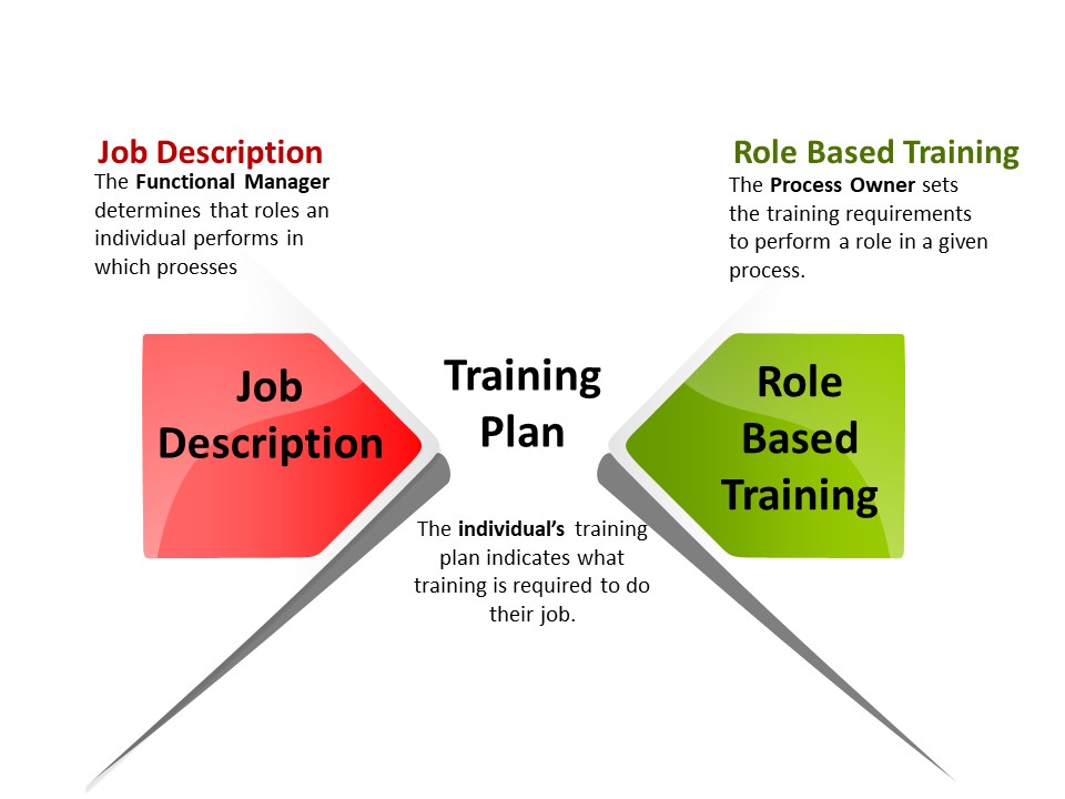 As discussed in the post “CVs and JDs and Training Plans” the training plan takes the job description and then says what a given individual needs for training requirements. It does this by looking at the role on a job description and cross-referencing it with the training requirements for the role established by the process owner.