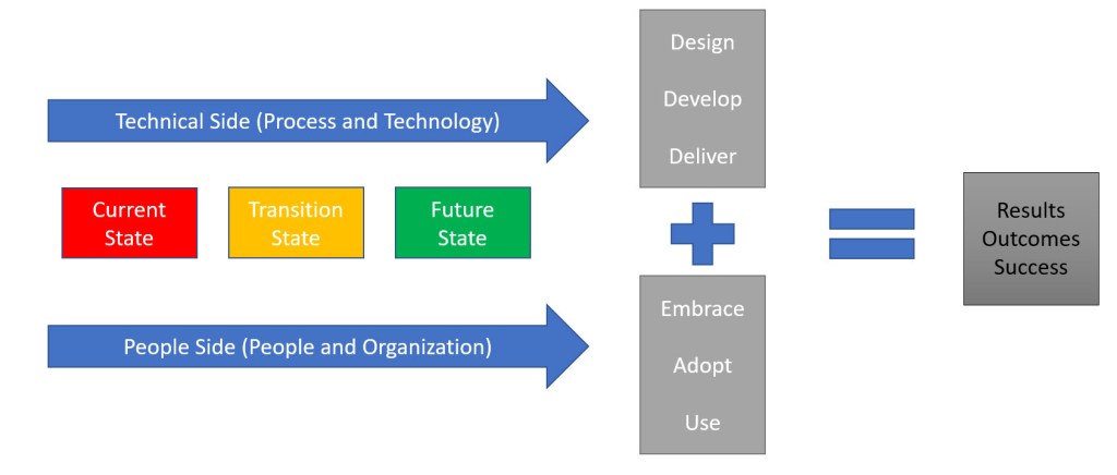 Change is a movement out of a current state (how things are today), through a transition state, and to a future state (how things will be done). Change management needs to be about how we manage that change from the entire system – people, organization, technology and process. Only by approaching change from a full system perspective do we ensure the full benefit and avoid unintended consequences.