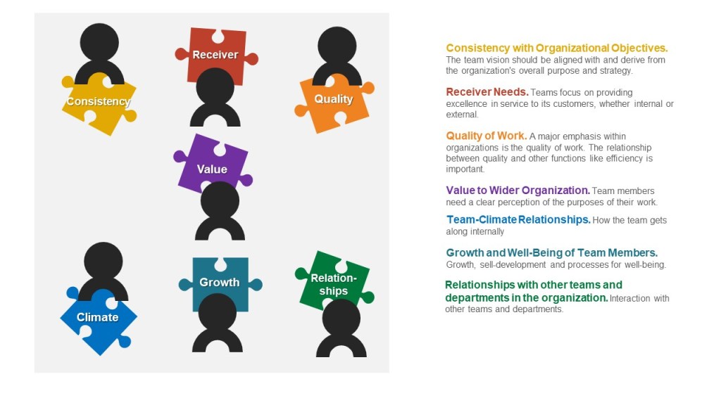 Teams exist to execute to organization objectives. In order to meet these objectives, a team needs a vision of itself. There are eight major elements to a team’s vision: