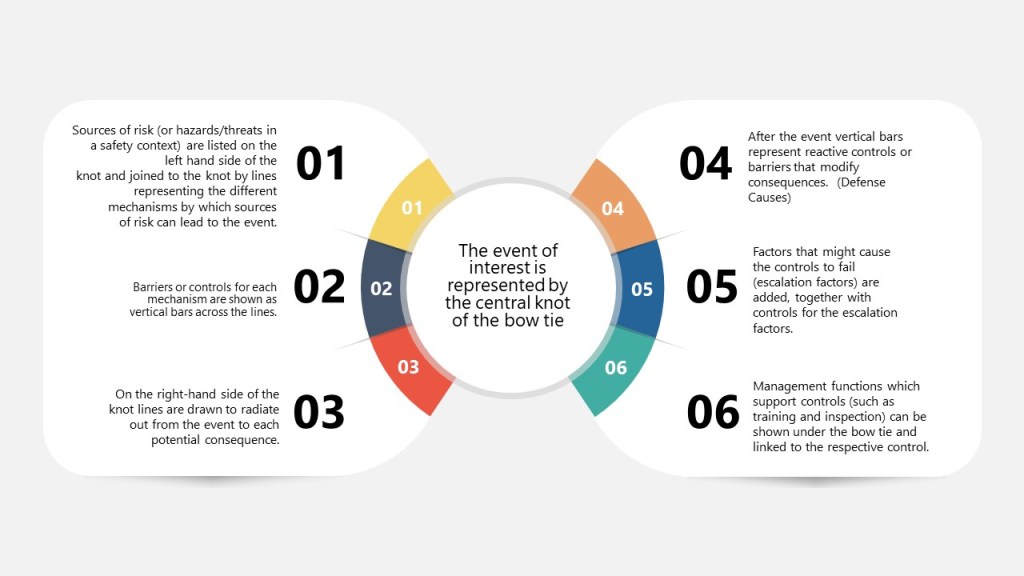 At the center of the bow-tie diagram is the “top event,” which represents the risk being analyzed. On the left side of the diagram are the potential causes of the top event, while on the right side are the potential consequences. The diagram also includes barriers or controls that can be put in place to prevent or mitigate the risk.