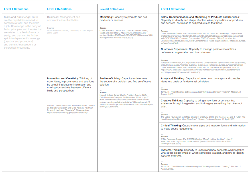 The World Economic Forum (WEF) has developed a Global Skills Taxonomy that provides a framework for aligning around a universal language for skills. It synthesizes and builds on existing taxonomies by integrating definitions and categorizations of skills that are of growing relevance in a fast-changing labor market 1