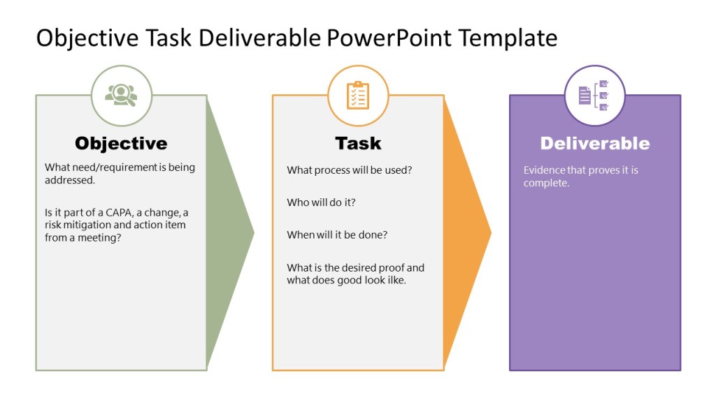 Tasks are all the same. They comprise of an objective, which is they why. A task (the who, when, what) and a deliverable (proof it is done)