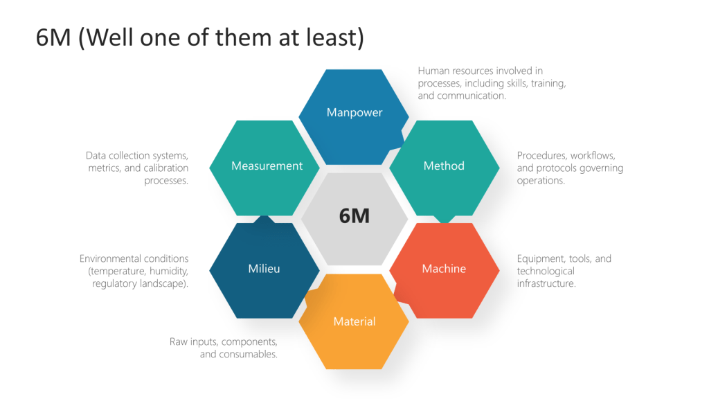 The 6M model addresses gaps in earlier iterations like the 4M framework by formalizing measurement and environmental factors as core variables. For instance, while the original 4M (Man, Machine, Material, Method) focused on internal production factors, the expanded 6M accounts for external influences like regulatory changes (Milieu) and data integrity (Measurement). This aligns with modern quality standards such as ISO 9001:2015, which emphasizes context-aware management systems.