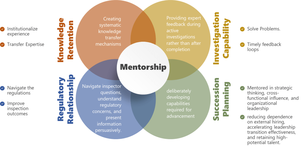 Knowledge retention during turnover—Perhaps most critically for pharmaceutical manufacturing, mentorship creates explicit transfer of institutional knowledge that otherwise walks out the door when experienced professionals leave. The experienced QA manager who remembers why specific change control categories exist, which regulatory commitments drove specific procedural requirements, and which historical issues inform current risk assessments—without deliberate mentorship, that knowledge disappears at retirement, leaving the organization vulnerable to repeating historical failures.