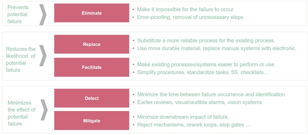 | Examples | Separation among manufacturing or packaging lines Emergency power supply Dedicated equipment Barcoding Keypad controlled doors Separated storage for components Software that prevents a workflow from going further if a field is not completed Redundant designs | Training and certifications Use of checklist Verification of critical task by a second person | Clear procedures and policies Adequate supervision Adequate load of work Periodic process audits |