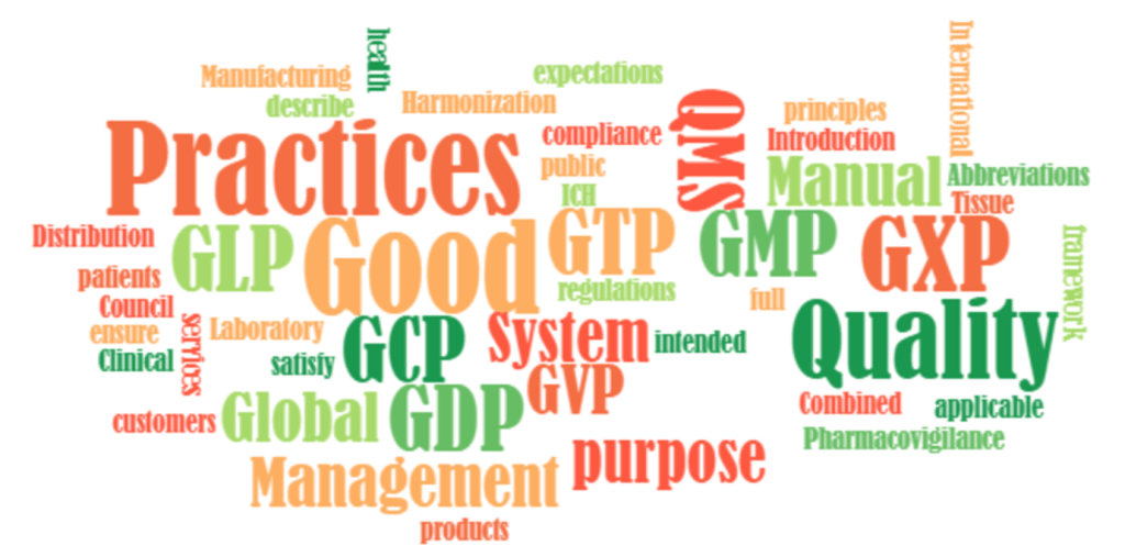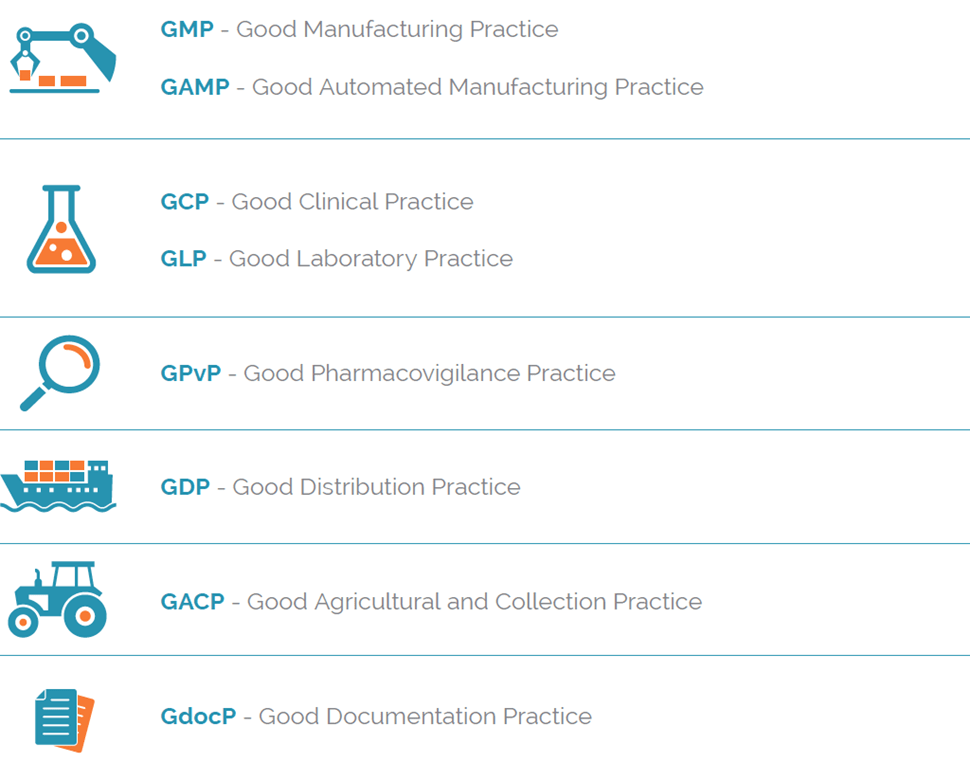 The Five big ones in pharma and medical devices are GLP, GCP, GMP, GDP and GPvP. Some of the others like GACP are pretty intesting in their application.