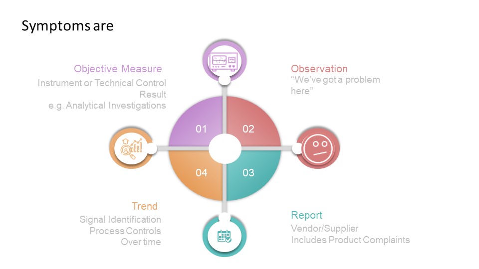 | Potential to adversely affect quality, safety, efficacy, performance or compliance of product | – Contamination – Product defect/deviation from process parameters or specification – Significant GMP deviations |