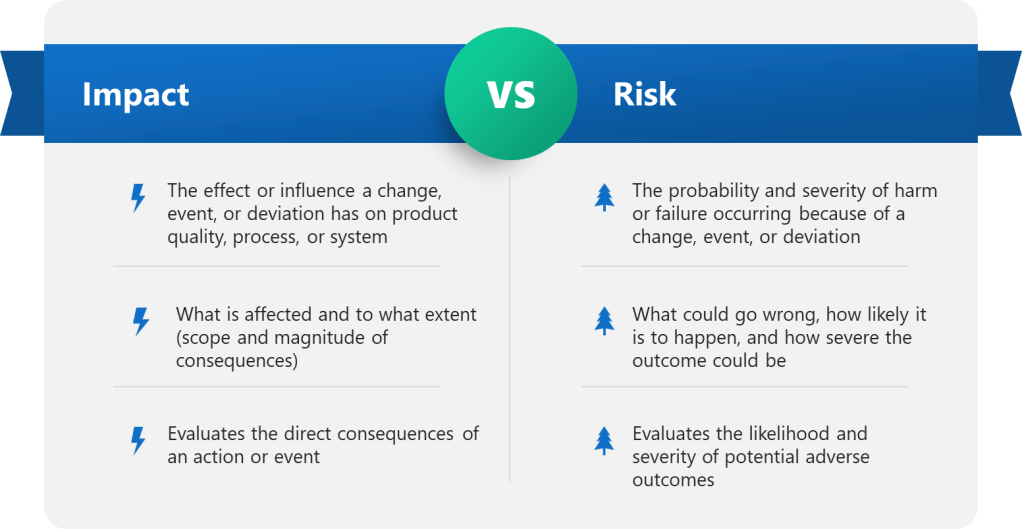 | Definition | The effect or influence a change, event, or deviation has on product quality, process, or system | The probability and severity of harm or failure occurring as a result of a change, event, or deviation |