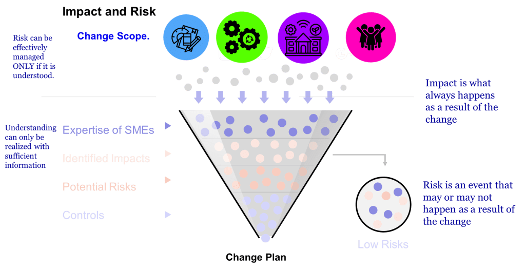 The difference between impact and risk is fundamental to effective quality management. The difference between impact and risk is critical. Impact is best thought of as ‘What do I need to do to make the change.’ Risk is ‘What could go wrong in making this change?'”