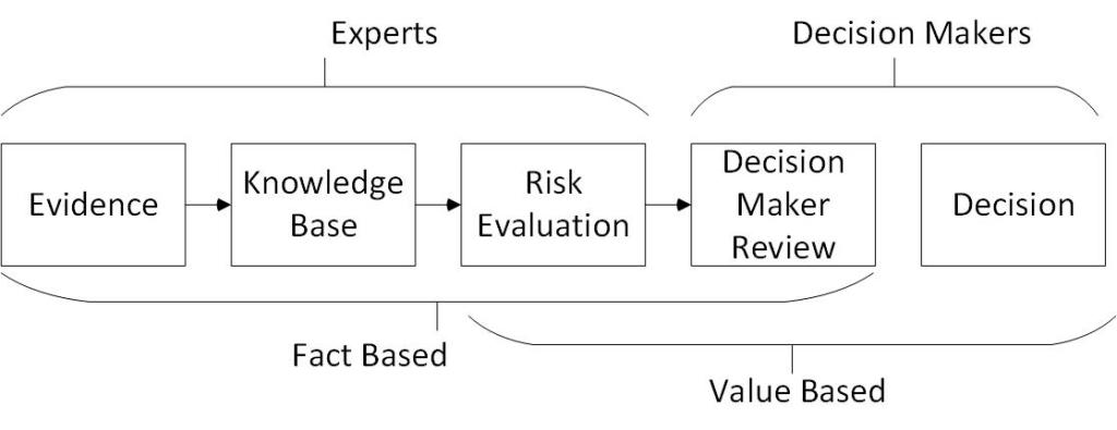 The risk evaluation is the step where the knowledge base is evaluated, and a summary judgment is reached on the risks and uncertainties involved in the case under investigation. This evaluation must take the values of the decision-makers into account and a careful understanding has to be had on just what the practical burden of proof is in the particular decision.